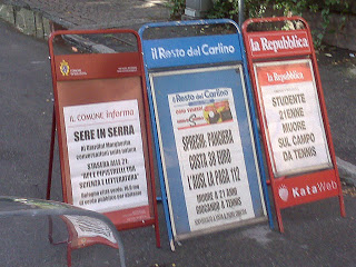 a) Non è niente male vedere le edicole che espongono la locandina comunale e sentire le reazioni delle persone comuni (che sono tutte positive, o almeno quelle che riferiscono a me lo sono). Sulla strada che faccio abitualmente in scooter la mattina per recarmi in Comune incontro 5 edicole, e dopo i primi giorni ora tutte espongono la civetta.