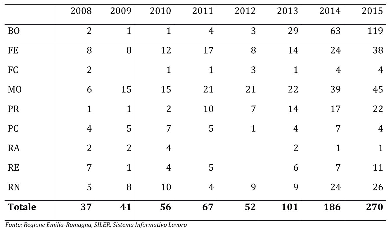 La seconda osservazione è che non sono equamente utilizzati in tutta la regione: attualmente sono più diffusi nell’area della città metropolitana di Bologna (27%) e a Modena (23%), seguite da Ferrara (16%) e Rimini (12%). Inoltre se provincie come Modena e Ferrara si sono attivate celermente, altri territori (in primis Bologna) dopo aver a lungo trascurato lo strumento, hanno visto una vera esplosione negli ultimi anni. Altri ancora (come Ravenna, Forlì-Cesena, Piacenza) continuano nei fatti ad ignorarlo.