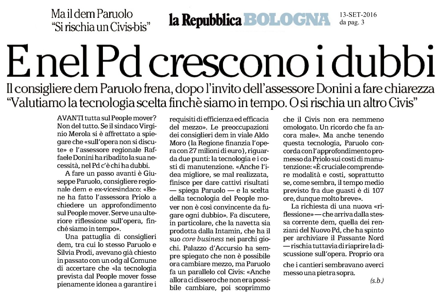 Nell’ultimo anno e mezzo, grazie alla collaborazione fra Regione e Comune/Città metropolitana, sul fronte della mobilità sono stati sciolti nodi cruciali e avviati lavori importanti. Il Passante di mezzo ci mette nelle condizioni di dare una soluzione credibile e in tempi ravvicinati ai problemi di mobilità del nodo bolognese che erano stati lasciati incancrenire coltivando per anni l’illusione del Passante Nord; e se lavoreremo bene la soluzione porterà anche benefici ambientali ai quartieri attraversati dalla tangenziale. Stiamo finalmente riprendendo in mano l’ipotesi del raddoppio della linea Bologna-Portomaggiore, cresce l’impegno sullo sviluppo dell’SFM. La Regione sta facendo cose davvero egregie sul trasporto ferroviario, dal canto suo il Comune di Bologna ha ripreso in mano l’ipotesi di linee di tram. Sono battaglie su cui mi sono speso da anni, e sono contento di registrare oggi svolte importanti, di cui rendo merito agli amministratori che ci stanno lavorando. Ecco, se riuscissimo anche a fugare i dubbi sul People Mover e a essere certi che quando diventerà operativo possa essere pienamente funzionale ed efficiente, sarebbe davvero una bella cosa. In questo senso ben vengano ulteriori riflessioni, finché siamo ancora in tempo.