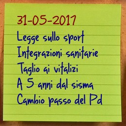 Ricostruzione: al via a Mirandola lo sportello imprese Sfinge; fino al 16 ottobre bando Inail aperto anche alle aziende agricole e agroalimentari. Innovazione: premiato il progetto Agende Digitali Locali in Emilia-Romagna, esperienza esemplare di pianificazione delle politiche ICT a livello locale. Centri per il riuso: l’Emilia-Romagna potenzia la rete per il recupero dei beni. Imprese: la piattaforma L2Pro insegna a proteggere e portare sul mercato le proprie innovazioni. Acquisti verdi: la Regione aggiorna gli strumenti operativi a supporto degli enti locali. Salute: al via la campagna della Regione #bastapoco per promuovere l’attività fisica, con le informazioni utili e gli eventi sul territorio. Sicurezza stradale: dall’Osservatorio regionale un invito a puntare sulla prevenzione, pedoni più sicuri con il giubbetto catarifrangente. Fondo Sociale Regionale: dalla Regione oltre 36 mln per servizi sociali e socio-sanitari. Ambiente: l’Europa promuove l’Emilia-Romagna per la depurazione delle acque reflue. Start up innovative: la Regione investe 2,2 milioni in formazione continua per imprenditori e manager. Cinema e spettacolo: bandi per l’occupazione nello spettacolo dal vivo e nell’industria cinematografica e dell’audiovisivo, domande entro il 21 e il 20 giugno. Vaccini: al via la campagna sulle vaccinazioni obbligatorie, anche nel 2016 in Emilia-Romagna vaccinazioni al di sotto della soglia di sicurezza del 95%. Vitalizi: nuovo taglio ai costi della politica. Centro meteo europeo: 40 milioni per il Data center a Bologna. Agricoltura: bando per imprese agricole, agriturismi e fattorie didattiche del Delta emiliano-romagnolo. Giovani agricoltori: dalla Regione 28,8 milioni di euro, domande fino al 29 settembre. Imprenditoria: crescono le imprese guidate da donne. Farmacie rurali: in arrivo i contributi della Regione, domande entro il 30 giugno. Tabagismo: diminuiscono i fumatori in Emilia-Romagna. Allerta meteo: online il nuovo portale. Ibc: Roberto Balzani è il nuovo Presidente. Calcio: la Spal torna in Serie A.