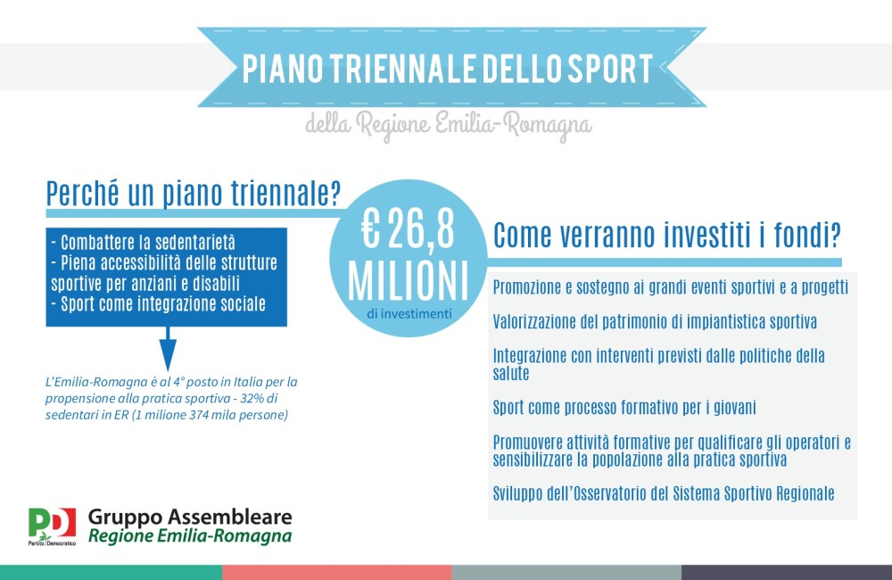 Oggi abbiamo approvato il Piano triennale dello Sport, definendo come strategie di politica sportiva: la promozione e il sostegno agli eventi sportivi, la valorizzazione dell’impiantistica, la piena accessibilità alla pratica sportiva, l’integrazione dello sport nelle politiche della salute e in quelle scolastiche e di formazione oltre che del turismo. Nel triennio 2018-2020 saranno investiti 26.750.000 euro (6,75 milioni saranno destinati a progetti sportivi per associazioni, enti e comuni, mentre 20 milioni, derivati dai fondi per lo sviluppo e la coesione, saranno rivolti ad interventi sull’impiantistica sportiva regionale).