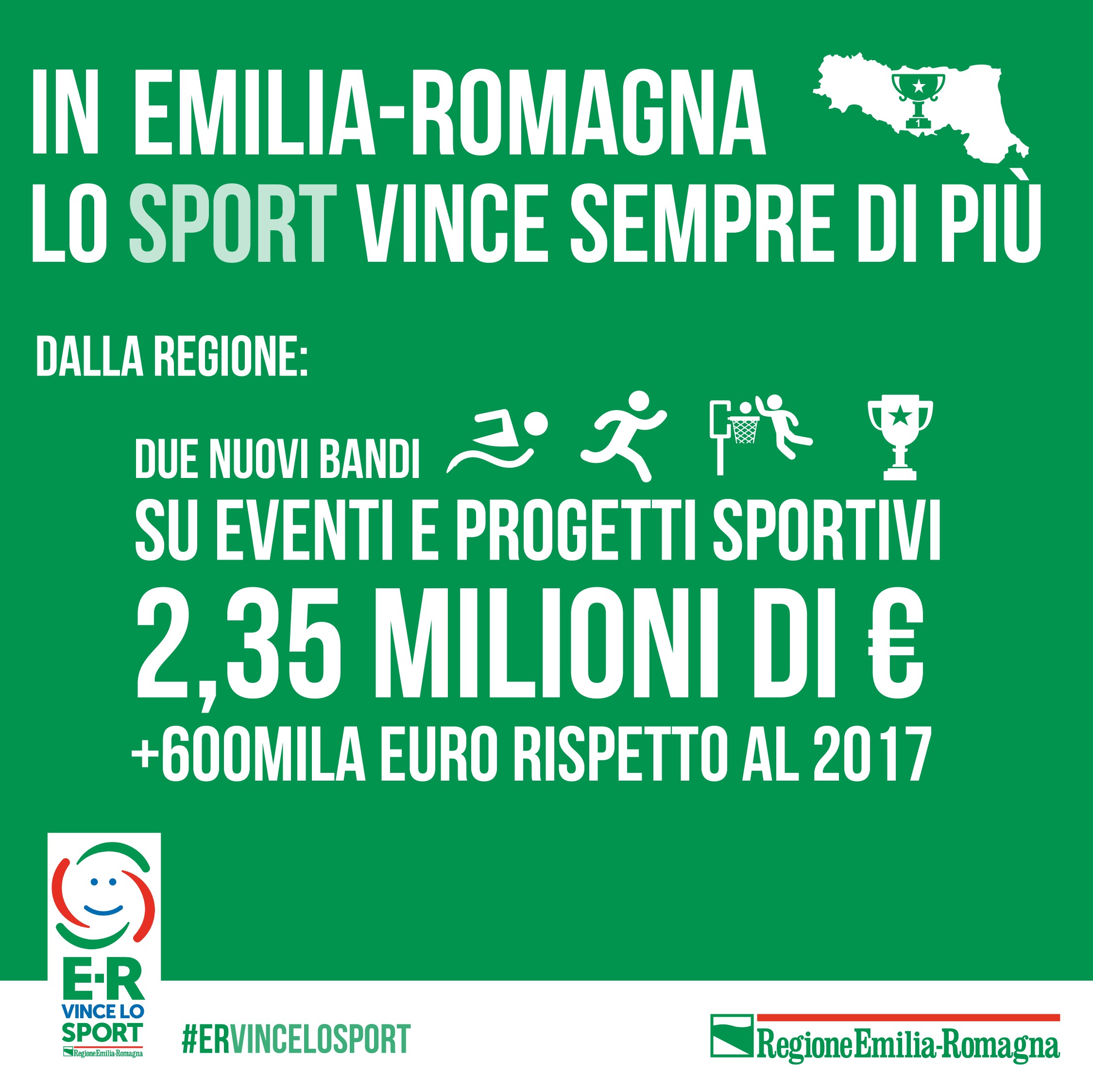 Nuovi bandi per lo Sport 2018: presto usciranno due nuovi bandi di cui uno per eventi sportivi, cui sono destinati 1 milione e 750 mila euro, e un altro per progetti sportivi, cui andranno 600 mila euro (per un totale di 2 milioni e 350 mila, ovvero il 34% in più rispetto al 2017). Oltre a ciò, aumenta di altri 10 milioni di euro il fondo per l’impiantistica sportiva rivolto ai Comuni e alle amministrazioni pubbliche, che vanno ad aggiungersi ai 20 milioni di cui era già dotato.