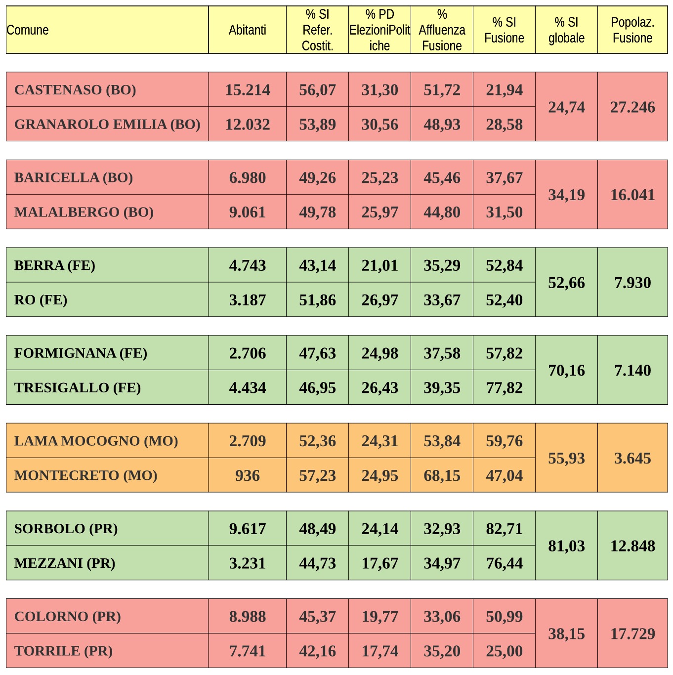 Una storia di lungo respiro. Andiamo nel parmense. Sorbolo e Mezzani hanno deciso di fondersi con una percentuale di sì superiore all’80%, ma questi due comuni sono da tempo uniti in una unione che li ha visti arrivare a gestire insieme il 95% dei servizi. E’ quindi la storia di una collaborazione ormai ventennale, che trova uno sbocco naturale nella fusione. Potremmo dire che i due comuni, dopo lungo fidanzamento, hanno deciso di sposarsi. I due comuni confinanti, Colorno e Torrile, hanno invece intrapreso la strada della fusione in tempi molto più recenti, senza una vera storia di cooperazione alle spalle, e lì i cittadini (soprattutto di Torrile) hanno nettamente bocciato la fusione. Se ci spostiamo nel ferrarese, Tresigallo e Formignana erano un comune unico fino al 1961. E’ stato quindi un ritorno al passato, un ripristinare una situazione preesistente, con tutti i vantaggi finanziari derivanti dalla fusione.