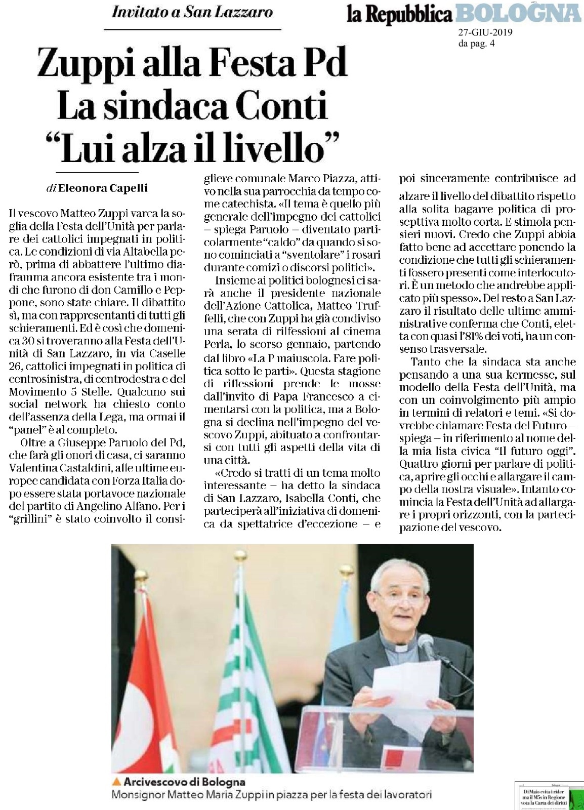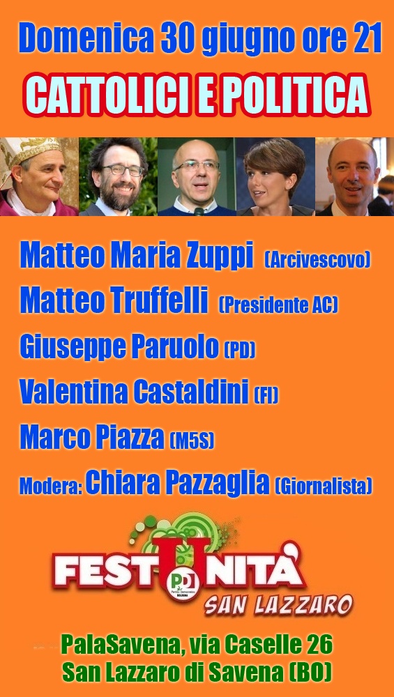 Domenica 30 giugno alle 21 parteciperò ad un interessante dibattito con Mons. Zuppi, arcivescovo di Bologna, Matteo Truffelli, presidente nazionale di Azione Cattolica, ed altri, su “cattolici e politica”. Chi fosse interessato ci trova alla Festa dell’Unità di San Lazzaro di Savena, in via Caselle 26 (PalaSavena). Qui c’è la locandina con l’elenco completo dei relatori, qui un articolo che ne parla. Vi aspetto!
