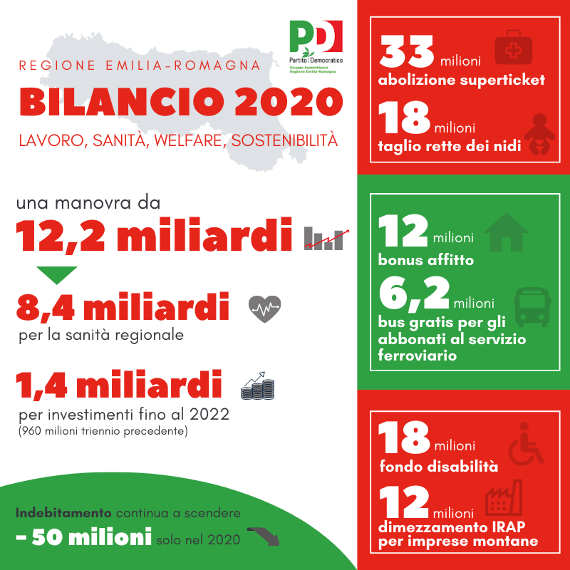 Via libera al bilancio 2020 della Regione Emilia-Romagna, una manovra da 12,2 miliardi di cui 8,4 per la sanità. Non un euro di tasse in più, come avvenuto in tutti i cinque anni della legislatura, ma anzi lo stanziamento dei fondi per rendere strutturali misure che fanno risparmiare agli emiliano-romagnoli oltre 80 milioni di euro l’anno, più di 240 milioni nel prossimo triennio. Abolizione dei superticket sanitari (33 milioni), dimezzamento dell’Irap per aziende, artigiani e commercianti in montagna (12 milioni), abbattimento delle rette dei nidi (18 milioni), bonus affitto per le famiglie in difficoltà (12 milioni) e bus gratis per gli abbonati al servizio ferroviario regionale (6,2 milioni). Provvedimenti, come nel caso dei superticket e delle rette dei nidi, sui quali l’Emilia-Romagna ha aperto la strada a decisioni cui lavora il Governo nazionale e che se approvate potrebbero liberare qui ulteriori risorse già nei prossimi mesi.