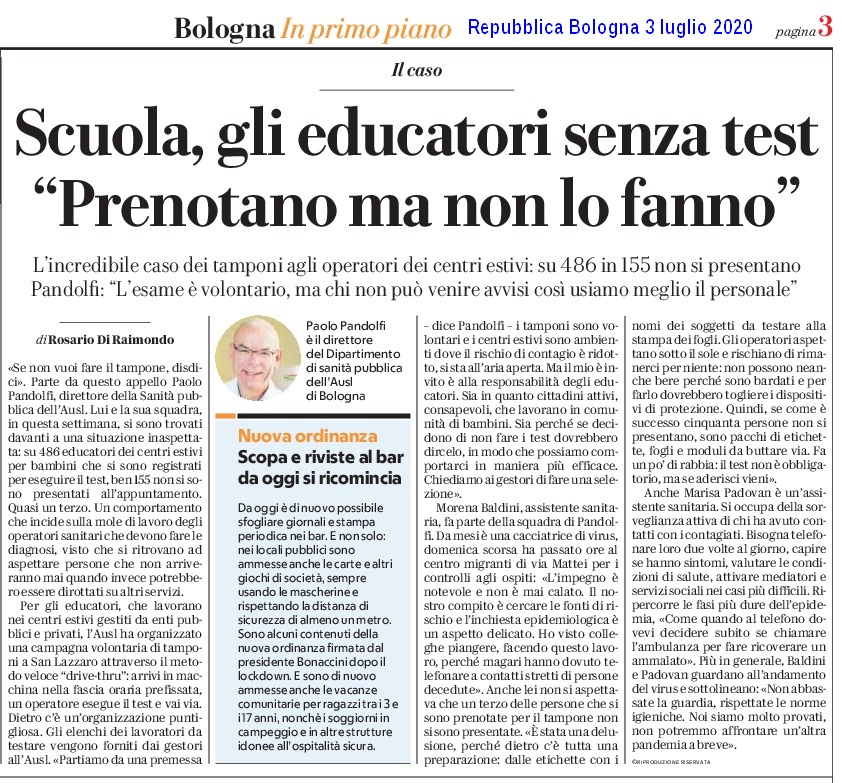 Nelle settimane scorse sono uscite diverse notizie che testimoniano una scarsa adesione agli screening anti-Covid (siano essi tamponi o test sierologici) previsti per taluni operatori. Se in alcuni casi non vi sono controindicazioni sul procedere comunque su base volontaria, ve ne sono altri su cui una mancata adesione desta preoccupazione. Ad esempio, non ritengo una buona notizia la scarsa adesione che ha ricevuto la campagna di test per gli educatori dei centri estivi organizzata dall’AUSL di Bologna: i giornali hanno riportato all’inizio di luglio che quasi un terzo di coloro che si erano prenotati non si è presentato (155 su 486).