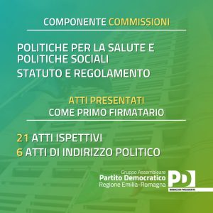 Per quanto riguarda il tema salute, ho chiesto fra l’altro alla Giunta di intervenire sulle prospettive della rete trapiantologica regionale; sulla rimborsabilità dei microinfusori insulinici anche per classi di pazienti diabetici con diabete di tipo 2; sulla situazione di difficoltà dei due centri privati accreditati eroganti prestazioni di ossigenoterapia iperbarica; sull’adeguamento delle strutture del Policlinico Sant’Orsola di Bologna per corrispondere ai nuovi standard di sicurezza imposti dalla pandemia da Covid-19; sui i tempi di attesa delle visite mediche sportive per il ritorno all’attività agonistica; sulla formazione degli interpreti di LIS (Lingua Italiana dei Segni).