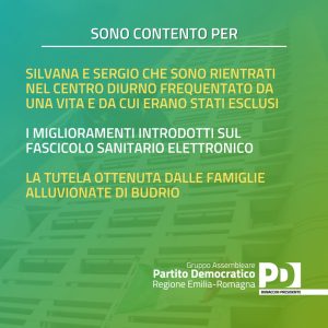 Nelle risoluzioni, ad esempio, ho sollecitato la Giunta a sostenere le case-famiglia e il sistema di accoglienza dei minori garantendone la qualità attraverso la promozione di una forma di accreditamento; ad attivarsi per ottenere che le persone con disabilità over 65 possano scegliere di rimanere nella soluzione abitativa in cui si trovano o di continuare a frequentare il centro diurno di una vita; a basare la tariffazione dell’acqua per uso domiciliare su fasce di consumo pro-capite, per evitare di penalizzare gli studenti fuori-sede domiciliati nel territorio; a rendere più equo e intelligente il cash-back di Stato; a sostenere l’appello dei Presidenti di Senato e Camera dei Deputati affinché i documenti relativi all’omicidio di Aldo Moro, alla strage di Bologna e a quella di Ustica, vengano desecretati.
