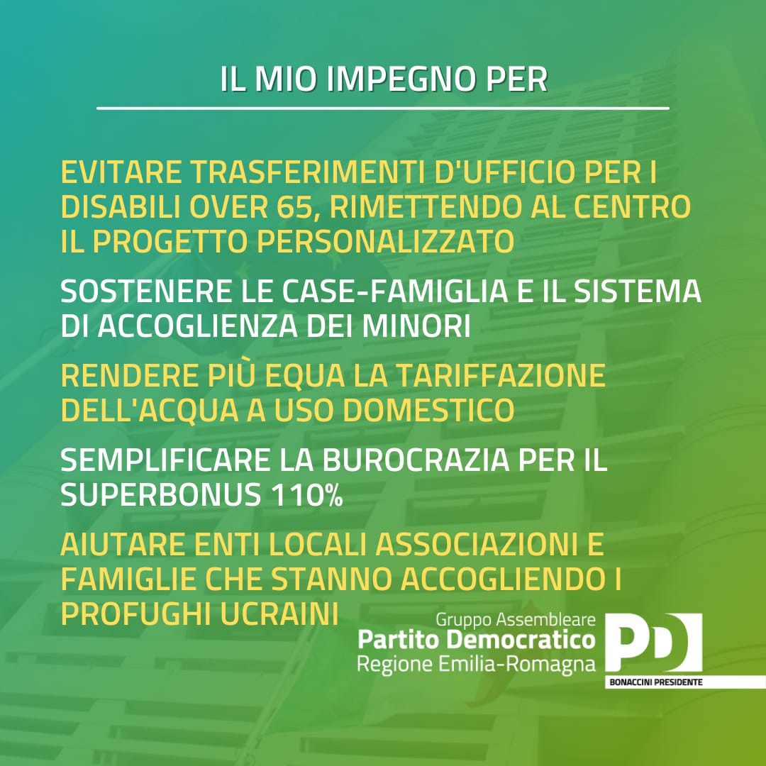 Nelle risoluzioni, ad esempio, ho sollecitato la Giunta a sostenere le case-famiglia e il sistema di accoglienza dei minori garantendone la qualità attraverso la promozione di una forma di accreditamento; ad attivarsi per ottenere che le persone con disabilità over 65 possano scegliere di rimanere nella soluzione abitativa in cui si trovano o di continuare a frequentare il centro diurno di una vita; a basare la tariffazione dell’acqua per uso domiciliare su fasce di consumo pro-capite, per evitare di penalizzare gli studenti fuori-sede domiciliati nel territorio; a rendere più equo e intelligente il cash-back di Stato; a sostenere l’appello dei Presidenti di Senato e Camera dei Deputati affinché i documenti relativi all’omicidio di Aldo Moro, alla strage di Bologna e a quella di Ustica, vengano desecretati.