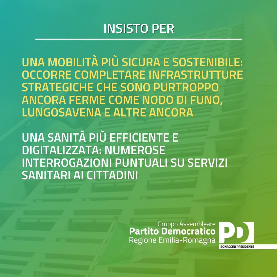 Per quanto riguarda il tema salute, ho chiesto fra l’altro alla Giunta di intervenire sulle prospettive della rete trapiantologica regionale; sulla rimborsabilità dei microinfusori insulinici anche per classi di pazienti diabetici con diabete di tipo 2; sulla situazione di difficoltà dei due centri privati accreditati eroganti prestazioni di ossigenoterapia iperbarica; sull’adeguamento delle strutture del Policlinico Sant’Orsola di Bologna per corrispondere ai nuovi standard di sicurezza imposti dalla pandemia da Covid-19; sui i tempi di attesa delle visite mediche sportive per il ritorno all’attività agonistica; sulla formazione degli interpreti di LIS (Lingua Italiana dei Segni).