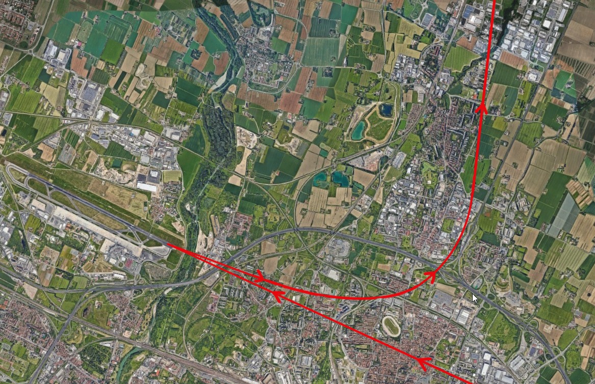 Purtroppo, anche dopo l’applicazione dell’Iresa, la situazione non è migliorata e di fatto ogni giorno si vede che il lato della città viene sempre utilizzato, a volte per i decolli e altre volte per gli atterraggi. Vale la pena sottolineare che le zone della città impattate dal rumore sono diverse a seconda che si parli di atterraggi o decolli, perché la traiettoria di avvicinamento per gli atterraggi è sostanzialmente rettilinea e in asse con la pista, mentre i decolli sono seguiti da una virata verso nord, che porta gli aerei a sorvolare zone del quartiere Navile, come ho cercato di disegnare nella cartina allegata, che ha ovviamente un valore puramente esemplificativo.