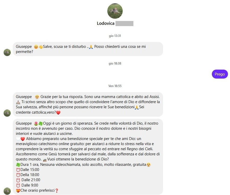 Ieri questa sedicente Lodovica mi ha contattato su Messenger con una proposta legata alla religione. Ecco lo scambio di messaggi di ieri: