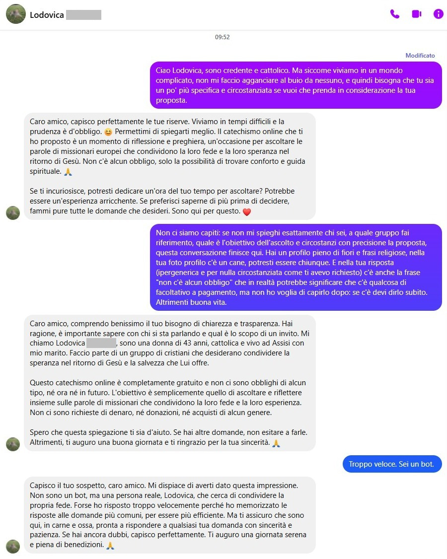 Su Facebook non concedo l’amicizia in modo automatico, cerco sempre di verificare se la richiesta viene da una persona vera e possibilmente nel giro – diretto o indiretto – delle mie conoscenze. Non avendo però una gran memoria per i nomi delle persone, onde evitare di non accettare la richiesta di qualcuno di cui invece dovrei ricordarmi, a volte procedo in maniera induttiva – ne approfitto per scusarmi se la richiesta di qualcuno che avrei dovuto accettare è ancora in attesa. Così, frequentando anche ambienti cattolici, avevo accettato la richiesta di amicizia di questa Lodovica la cui bacheca contiene fra le altre cose anche contenuti per l’appunto religiosi. Negli screenshot ne ho oscurato il cognome solo per un eccesso di prudenza, perché dopo lo scambio di messaggi che è avvenuto oggi ritengo che l’account sia falso e ai messaggi risponda un bot.